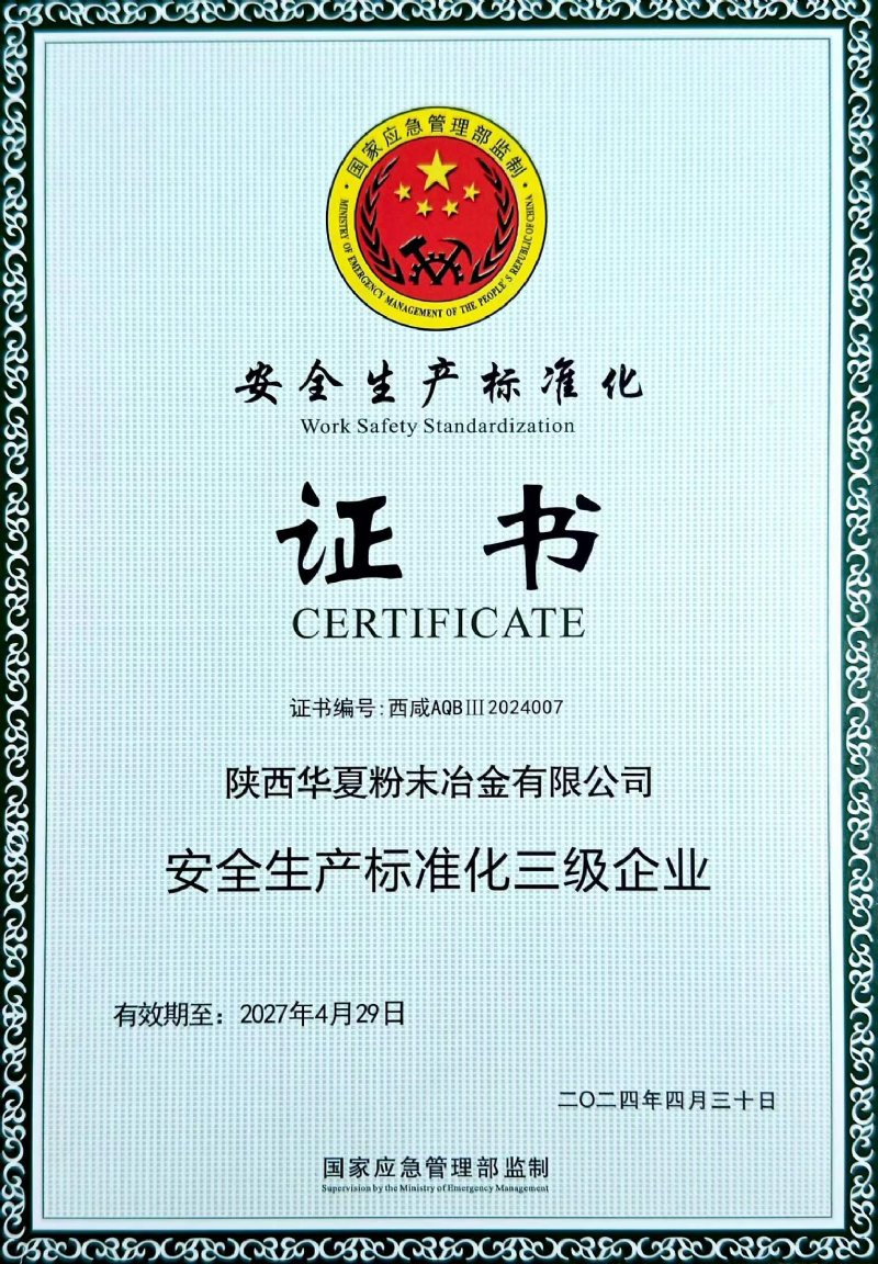 近日,陜西華夏粉末冶金有限責(zé)任公司正式獲得安全生產(chǎn)標(biāo)準(zhǔn)化資質(zhì),這是公司安全生產(chǎn)歷程中的一座重要里程碑。安全生產(chǎn)標(biāo)準(zhǔn)化涵蓋了從生產(chǎn)設(shè)施到人員操作、從風(fēng)險(xiǎn)評(píng)估到應(yīng)急管理等一系列環(huán)節(jié),此資質(zhì)標(biāo)志著華夏公司在安全生產(chǎn)管理體系建設(shè)、安全操作規(guī)范執(zhí)行和全體員工嚴(yán)謹(jǐn)落實(shí)安全措施等安全生產(chǎn)各方面都達(dá)到了高標(biāo)準(zhǔn)。